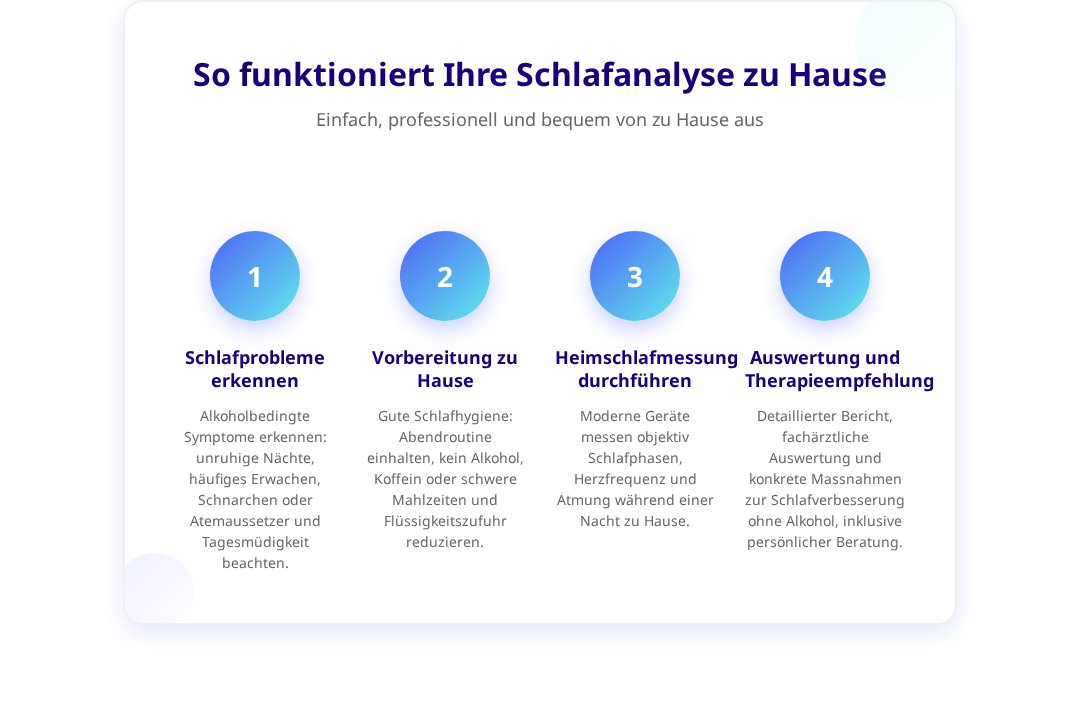 Bei Sleep Lab bieten wir umfassende Schlafdiagnostik in den vertrauten eigenen vier Wänden. Unsere modernen Messgeräte erfassen alle relevanten Parameter einer Nacht und ermöglichen es, die Auswirkungen von Alkohol auf Ihren individuellen Schlaf objektiv zu bewerten. Nach der Messung erhalten Sie einen detaillierten Bericht, der Ihre Schlafqualität, mögliche Störungen und konkrete Handlungsempfehlungen enthält.
