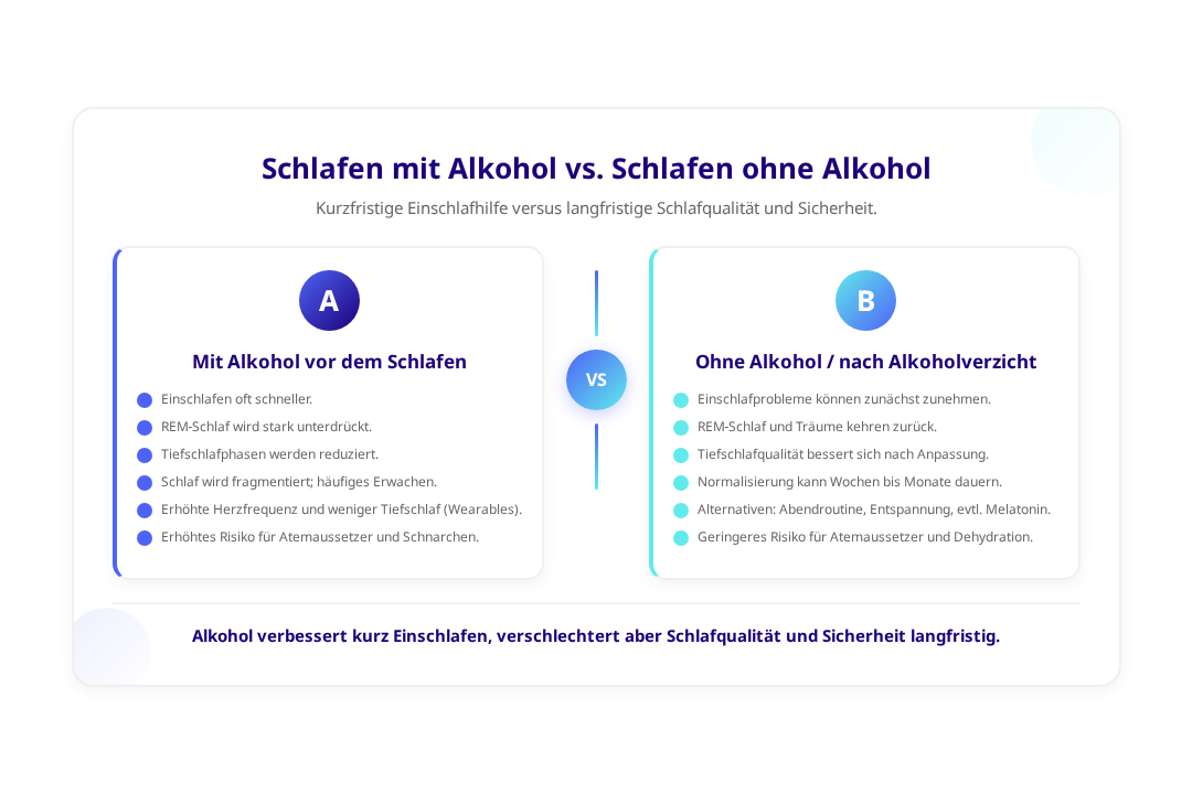 Die Wirkung von Alkohol auf den Schlaf ist ein zweischneidiges Schwert. Einerseits verkürzt er die Zeit bis zum Einschlafen, andererseits fragmentiert er die Schlafphasen und reduziert die Tiefschlaf- und REM-Phasen erheblich. Diese Störungen können sich über Wochen hinziehen – selbst nachdem der Alkoholkonsum eingestellt wurde.