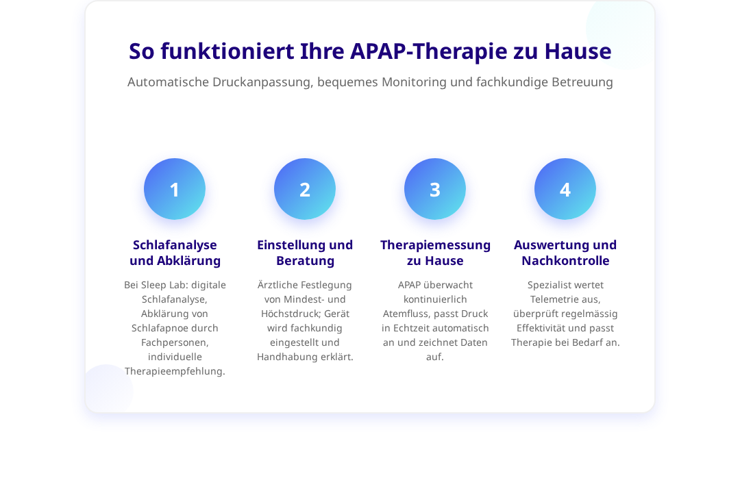 Nach einer umfassenden Schlafanalyse können unsere Spezialisten die optimale Therapieform empfehlen – sei es CPAP, APAP oder alternative Ansätze. Die Auswahl erfolgt individuell basierend auf der Schwere der Erkrankung, den persönlichen Bedürfnissen und medizinischen Begleitumständen.