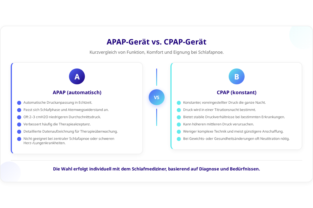 APAP-Geräte bieten mehr Komfort durch automatische Druckanpassung und können die Therapieakzeptanz verbessern. Sie sind jedoch nicht für alle Patienten geeignet. Menschen mit zentraler Schlafapnoe oder bestimmten Herzerkrankungen benötigen oft konstante CPAP-Drücke. Die Wahl sollte individuell mit dem Schlafmediziner besprochen werden.
