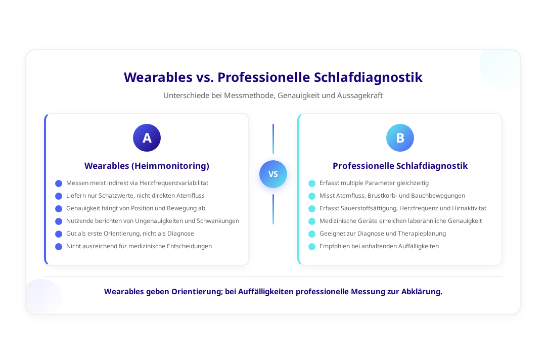 Im Vergleich zu direkten Atemflussmessungen, wie sie in professionellen Schlafstudien verwendet werden, können Consumer-Wearables nur Schätzwerte liefern. Für medizinische Entscheidungen oder bei ernsten Verdachtsfällen sind diese Geräte daher nicht ausreichend.