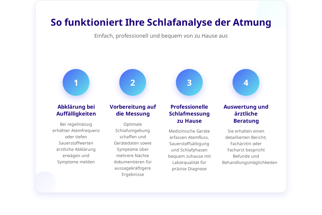 Nach der Messung erhalten Sie einen detaillierten schriftlichen Bericht, der nicht nur Ihre Atemfrequenz, sondern auch Sauerstoffsättigung, Schlafphasen und andere relevante Parameter analysiert. Bei Bedarf kann eine fachärztliche Auswertung und ein persönliches Arztgespräch die nächsten Schritte für eine optimale Behandlung klären.