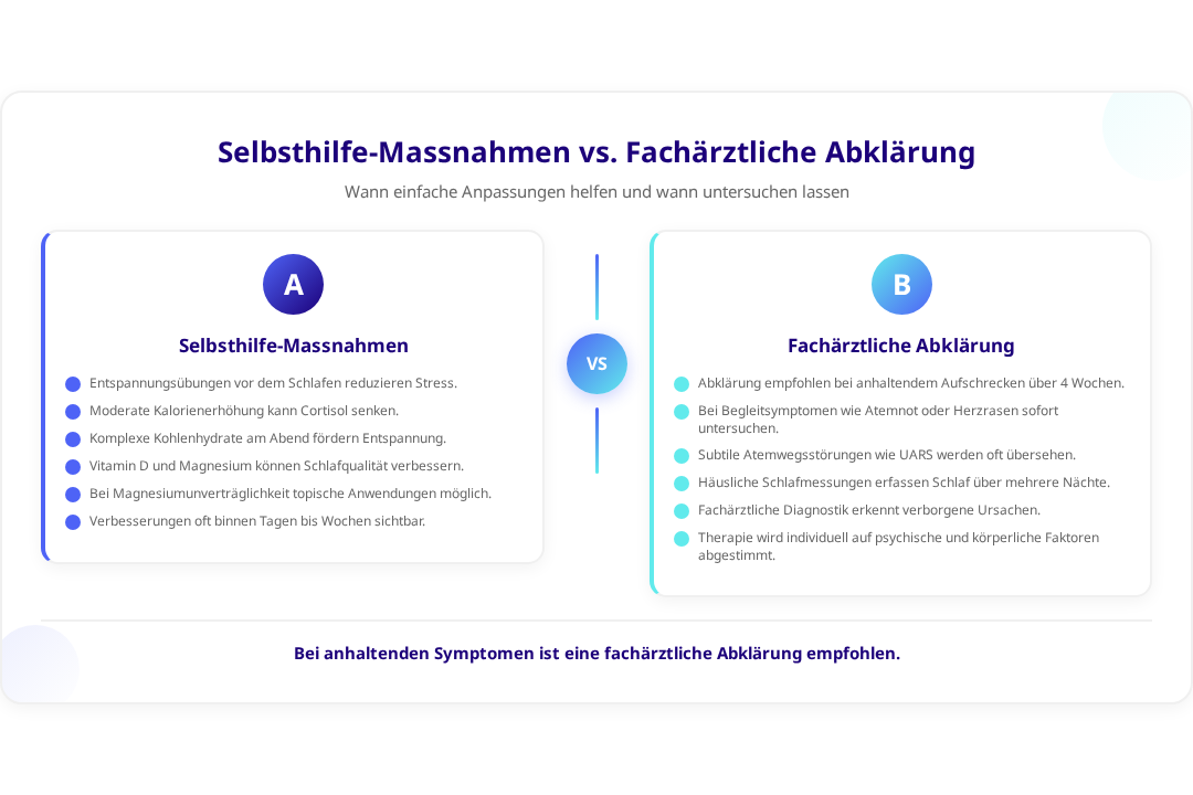 Wenn das nächtliche Aufschrecken trotz Lifestyle-Anpassungen über 4 Wochen anhält, bei begleitenden Symptomen wie Atemnot oder wenn die Schlafstörung Ihre Tagesleistung beeinträchtigt, ist eine fachärztliche Abklärung empfehlenswert. Eine professionelle Schlaftherapie kann dann individualisierte Lösungsansätze bieten.