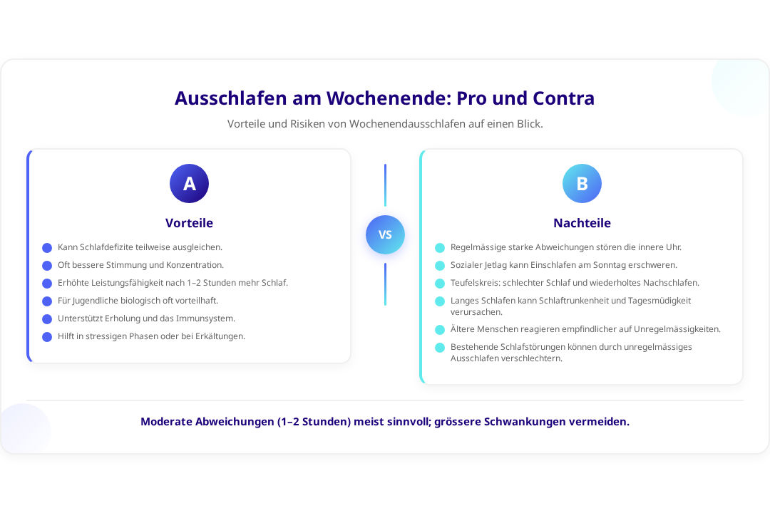 Experten empfehlen, die gewohnte Aufwachzeit am Wochenende um maximal 1-2 Stunden zu verschieben. Grössere Abweichungen können zu sozialem Jetlag führen und das Einschlafen am Sonntagabend erschweren.
