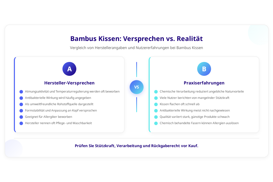 Bambus Kissen können für manche Menschen eine Verbesserung darstellen, sind jedoch kein Wundermittel für besseren Schlaf. Die Qualität variiert stark zwischen den Herstellern, und viele Produkte halten nicht, was sie versprechen. Vor dem Kauf sollten Sie Ihre spezifischen Bedürfnisse und Schlafgewohnheiten analysieren.