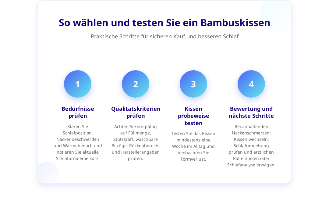 Für Personen mit leichten Schlafproblemen oder als Übergangslösung können Bambus Kissen durchaus eine Verbesserung darstellen. Wichtig ist jedoch, realistische Erwartungen zu haben und das Kissen als einen von vielen Faktoren für gesunden Schlaf zu betrachten.[3]