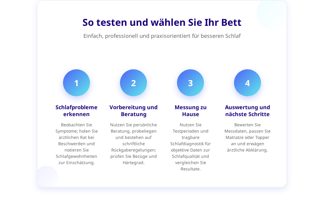 Wenn trotz optimaler Schlafumgebung Probleme bestehen: bei anhaltenden Rückenschmerzen, Schnarchen mit Atemaussetzern, extremer Tagesmüdigkeit oder unruhigem Schlaf. Moderne Schlafdiagnostik kann zu Hause durchgeführt werden und objektive Daten über Ihre Schlafqualität liefern. Manchmal liegt das Problem nicht am Bett, sondern an medizinischen Ursachen.