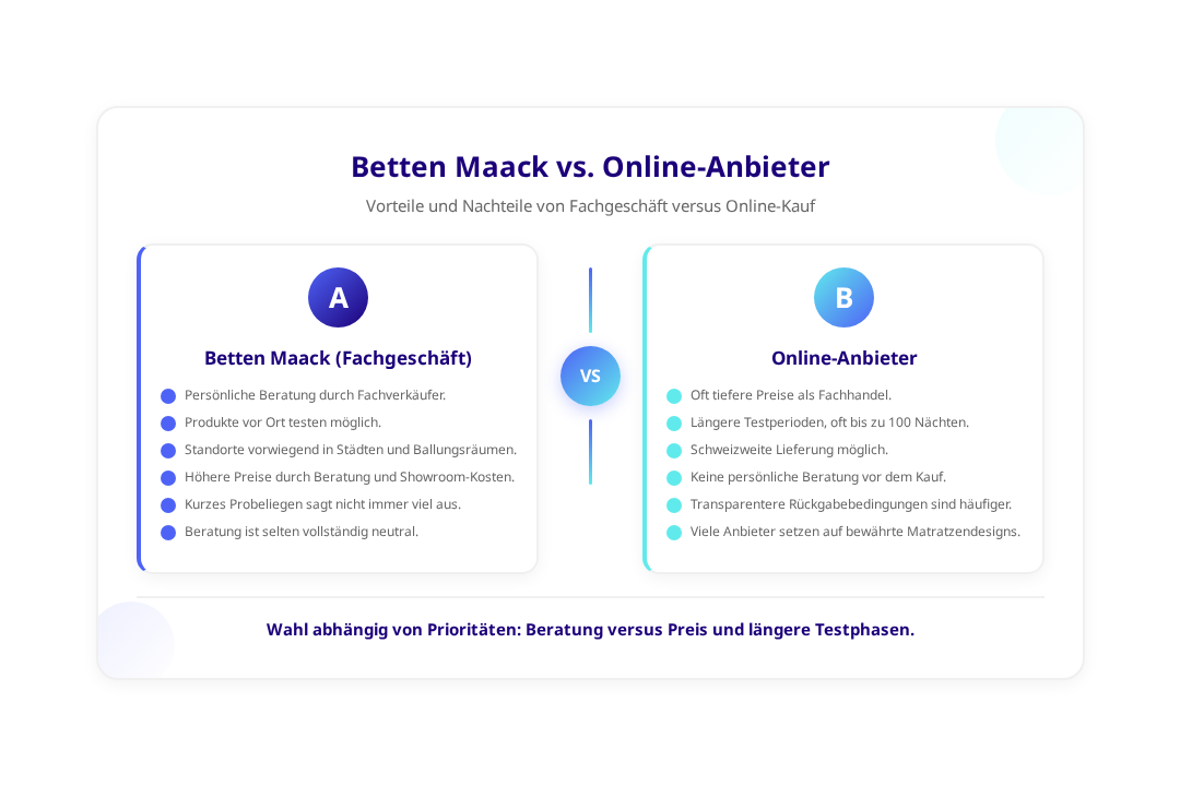 Das hängt von Ihren Prioritäten ab. Betten Maack bietet persönliche Beratung und die Möglichkeit zum Probeliegen, kostet aber mehr. Online-Anbieter haben oft bessere Preise und längere Testperioden (bis zu 100 Nächte), dafür keine persönliche Beratung vor Ort.