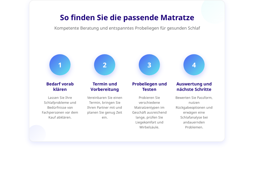 Erfahrene Schlafberater können durch gezielte Fragen und Beobachtung beim Probeliegen die optimale Matratze identifizieren. Dabei werden Faktoren wie Körpergrösse, Gewicht, bevorzugte Schlafposition und eventuelle Beschwerden berücksichtigt. Diese individuelle Herangehensweise macht den Unterschied zwischen einem Fehlkauf und jahrelang erholsamem Schlaf aus.[1]