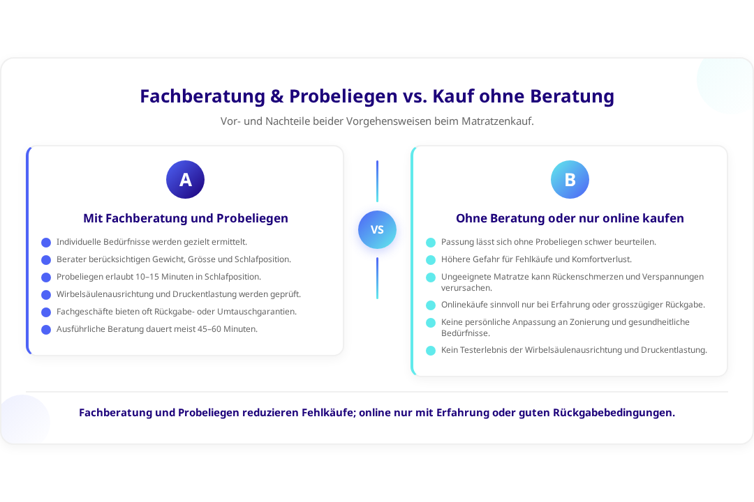 Probeliegen ist essentiell und sollte mindestens 10-15 Minuten in der gewohnten Schlafposition dauern. Online-Käufe sind nur dann sinnvoll, wenn bereits Erfahrungen mit dem Matratzentyp vorliegen oder grosszügige Rückgabefristen angeboten werden.