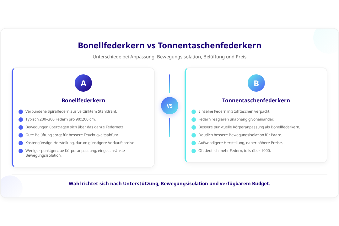 - Die Verbindung der Federn führt zu weniger punktgenauer Körperanpassung als bei Taschenfederkern-Systemen