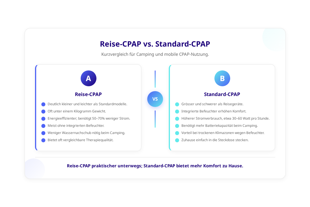 Ja, Standard-CPAP-Geräte funktionieren beim Camping, benötigen jedoch mehr Strom als Reisemodelle. Eine ausreichend dimensionierte Batterie oder Stromquelle ist essentiell. Reise-CPAP-Geräte sind jedoch energieeffizienter und praktischer für den mobilen Einsatz.
