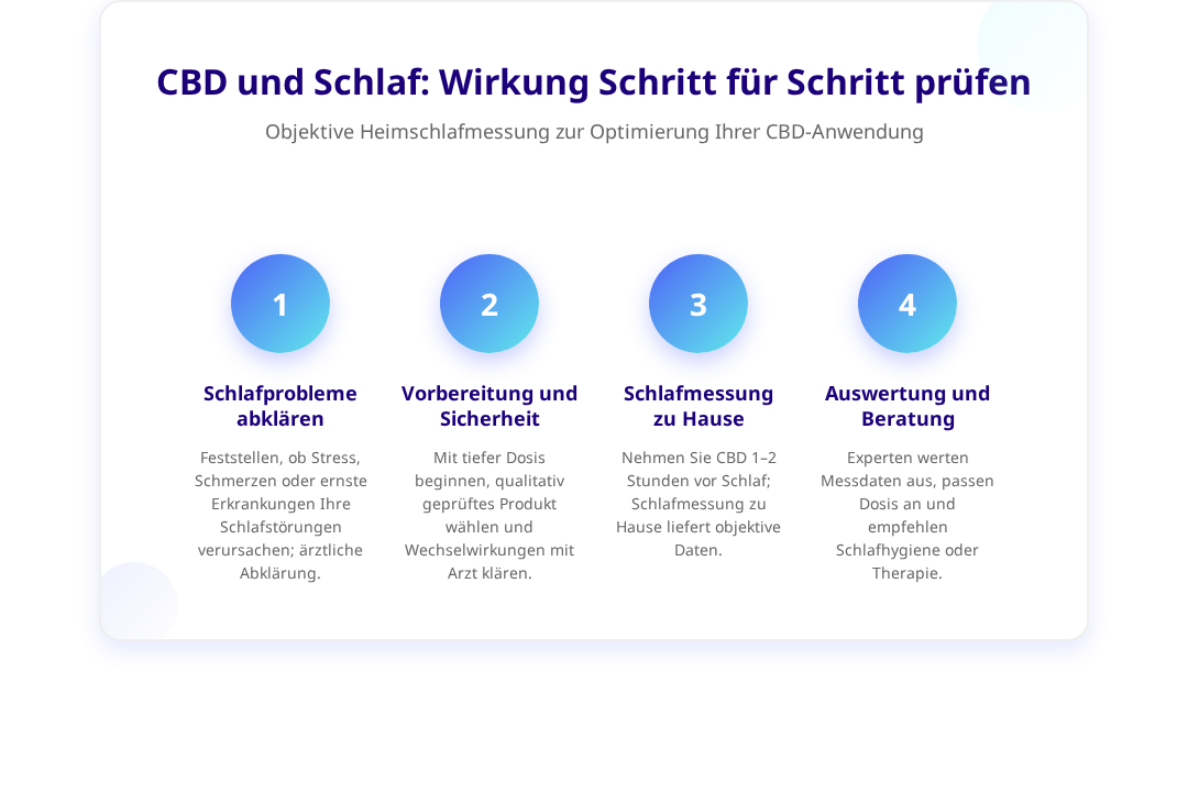 Wenn Sie CBD für besseren Schlaf verwenden möchten oder bereits verwenden, aber weiterhin Schlafprobleme haben, kann eine professionelle Schlafanalyse wichtige Erkenntnisse liefern. Mit unserer Schlafmessung zu Hause erhalten Sie objektive Daten über Ihre Schlafqualität, die bei der Optimierung Ihrer CBD-Anwendung helfen können.