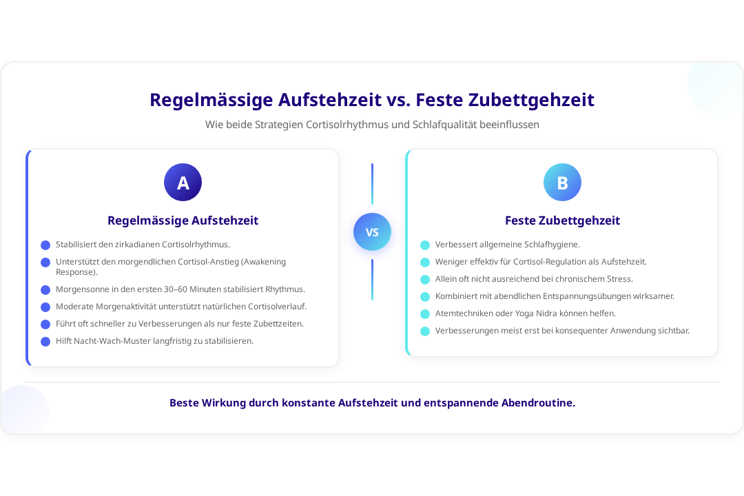 - Regelmässige Aufstehzeiten sind wichtiger als feste Zubettgehzeiten für die Cortisol-Regulation