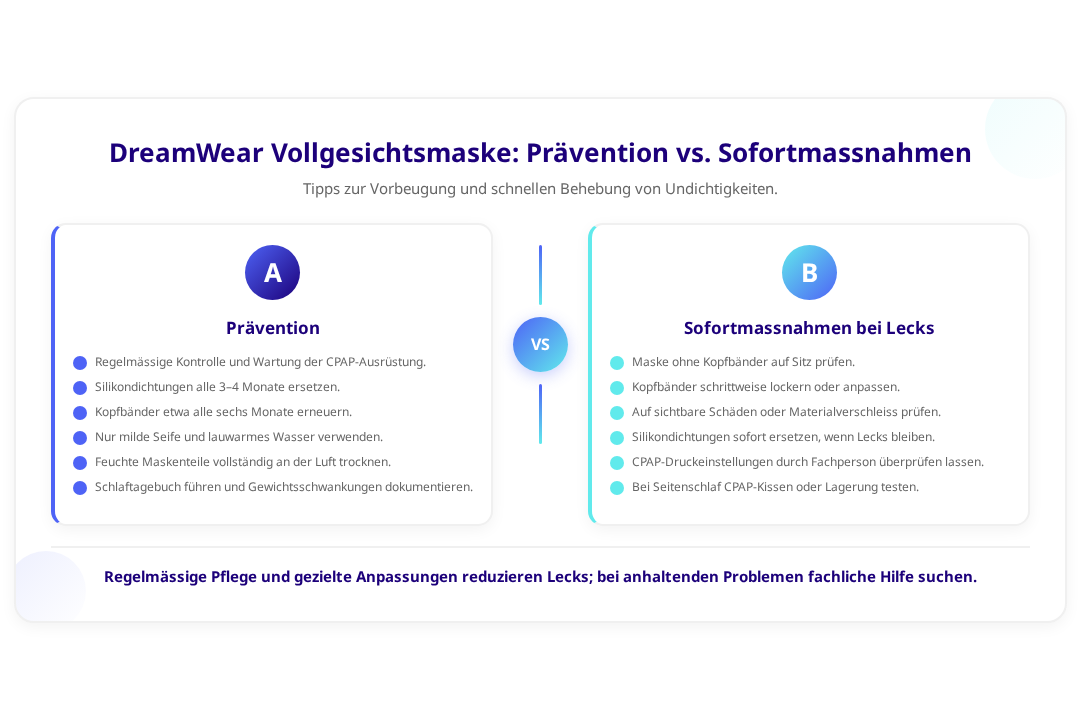 Die DreamWear Vollgesichtsmaske gehört zu den beliebteren CPAP-Masken auf dem Markt, doch viele Anwenderinnen und Anwender berichten von Problemen mit Undichtigkeiten. Diese Lecks können den Therapieerfolg erheblich beeinträchtigen und zu unruhigem Schlaf führen. Undichtigkeiten entstehen meist durch eine Kombination aus falscher Passform, abgenutzten Materialien und ungeeigneten Einstellungen.[1]