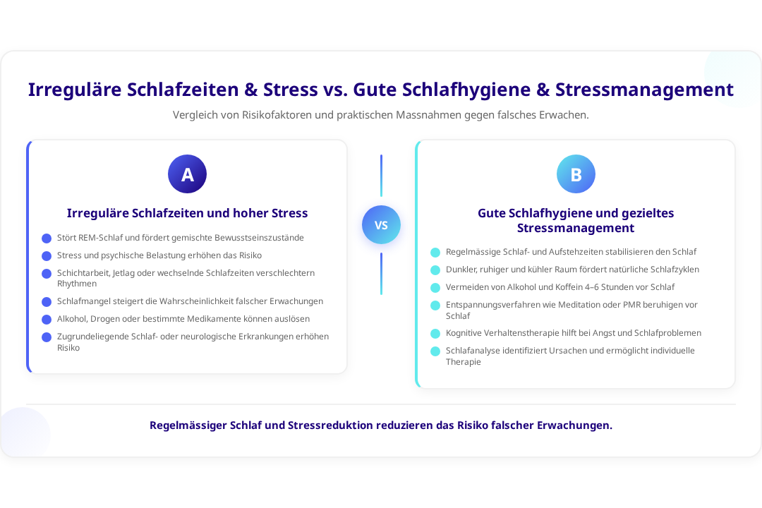 Unregelmässige Schlafzeiten und Schlafmangel verstärken die Wahrscheinlichkeit für falsches Erwachen erheblich. Schichtarbeit, Jetlag oder häufige Veränderungen der Schlafenszeiten können die natürlichen Schlafrhythmen durcheinanderbringen. Der Körper verliert dadurch die Fähigkeit, zwischen den verschiedenen Schlafphasen sauber zu unterscheiden, was zu vermischten Bewusstseinszuständen führen kann.