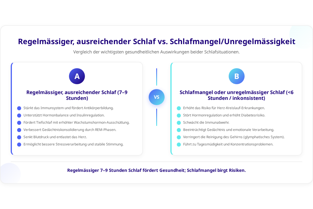 Die meisten Erwachsenen benötigen 7-9 Stunden Schlaf pro Nacht für optimale Gesundheit. Diese Empfehlung basiert auf umfangreichen wissenschaftlichen Studien, die zeigen, dass in diesem Bereich die gesundheitsfördernden Prozesse des Schlafs am besten funktionieren. Individuelle Unterschiede sind jedoch normal – manche Menschen fühlen sich bereits nach 7 Stunden vollständig erholt, andere benötigen die vollen 9 Stunden.
