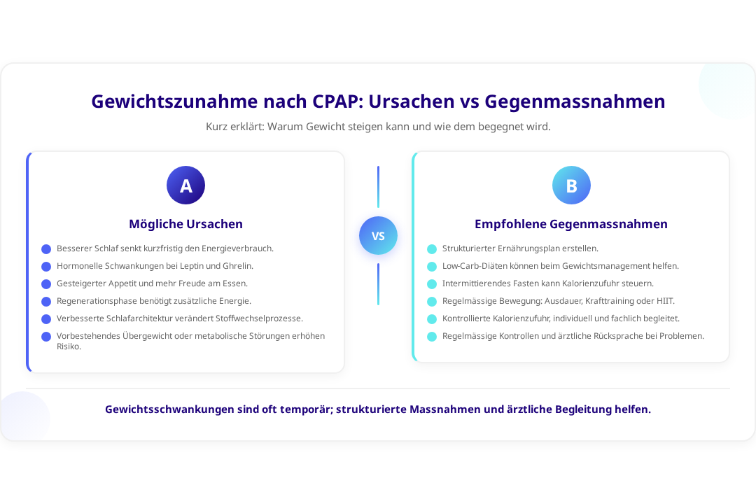 Eine Gewichtszunahme nach dem Start einer CPAP-Therapie ist kein seltenes Phänomen. Verschiedene physiologische und verhaltensbedingte Faktoren können dazu beitragen. Die gute Nachricht ist, dass sich diese Veränderungen durch gezielte Maßnahmen oft erfolgreich steuern lassen.