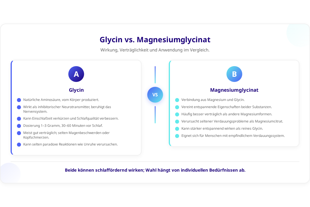 Reines Glycin ist eine einzelne Aminosäure, während Magnesiumglycinat eine Verbindung aus Magnesium und Glycin ist. Magnesiumglycinat bietet die Vorteile beider Substanzen und ist oft besser verträglich als andere Magnesiumformen, kann aber stärker entspannend wirken als reines Glycin.