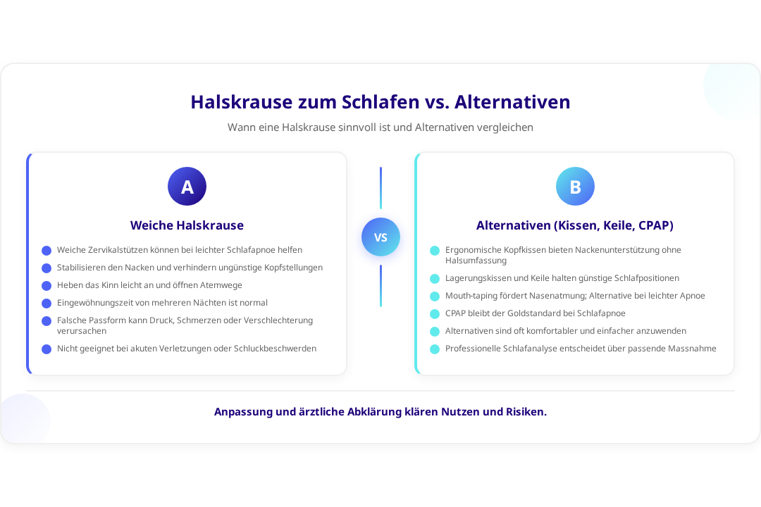 Eine weiche Halskrause kann bei leichtem Schnarchen helfen, indem sie die Atemwege durch eine veränderte Kopfhaltung offener hält. Bei ausgeprägtem Schnarchen oder Schlafapnoe ist jedoch eine ärztliche Abklärung notwendig.
