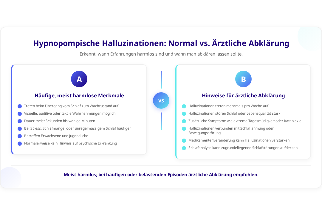 Obwohl hypnopompische Halluzinationen meist harmlos sind, gibt es Situationen, in denen eine ärztliche Abklärung ratsam ist. Dies ist besonders dann der Fall, wenn die Halluzinationen sehr häufig auftreten, den Schlaf erheblich stören oder mit anderen Symptomen einhergehen.