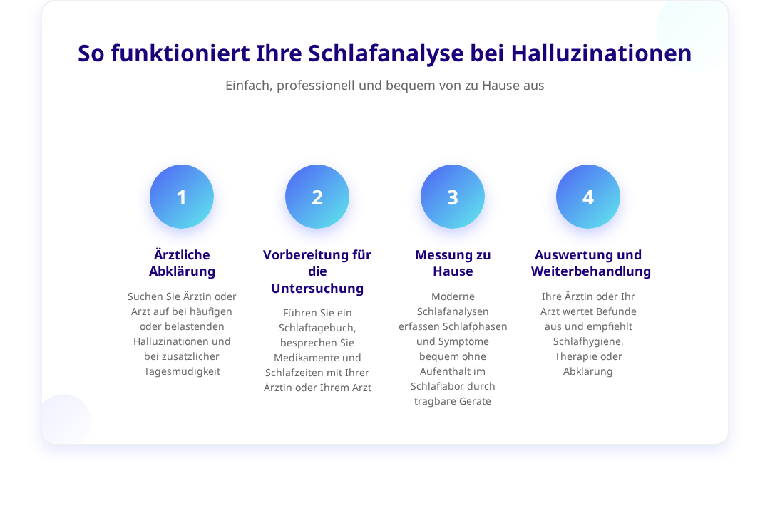 Eine umfassende Schlafanalyse kann Aufschluss darüber geben, ob möglicherweise eine behandlungsbedürftige Schlafstörung vorliegt, die zu den Halluzinationen beiträgt. Besonders bei wiederholten Episoden oder wenn die Halluzinationen die Lebensqualität beeinträchtigen, ist eine professionelle Einschätzung wertvoll.