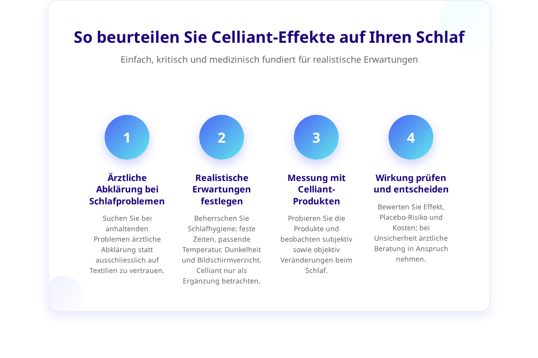 - Betrachten Sie Celliant als mögliche Ergänzung, nicht als Ersatz für bewährte Schlafhygiene-Massnahmen