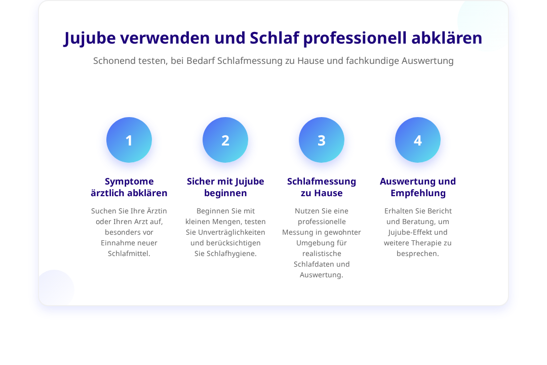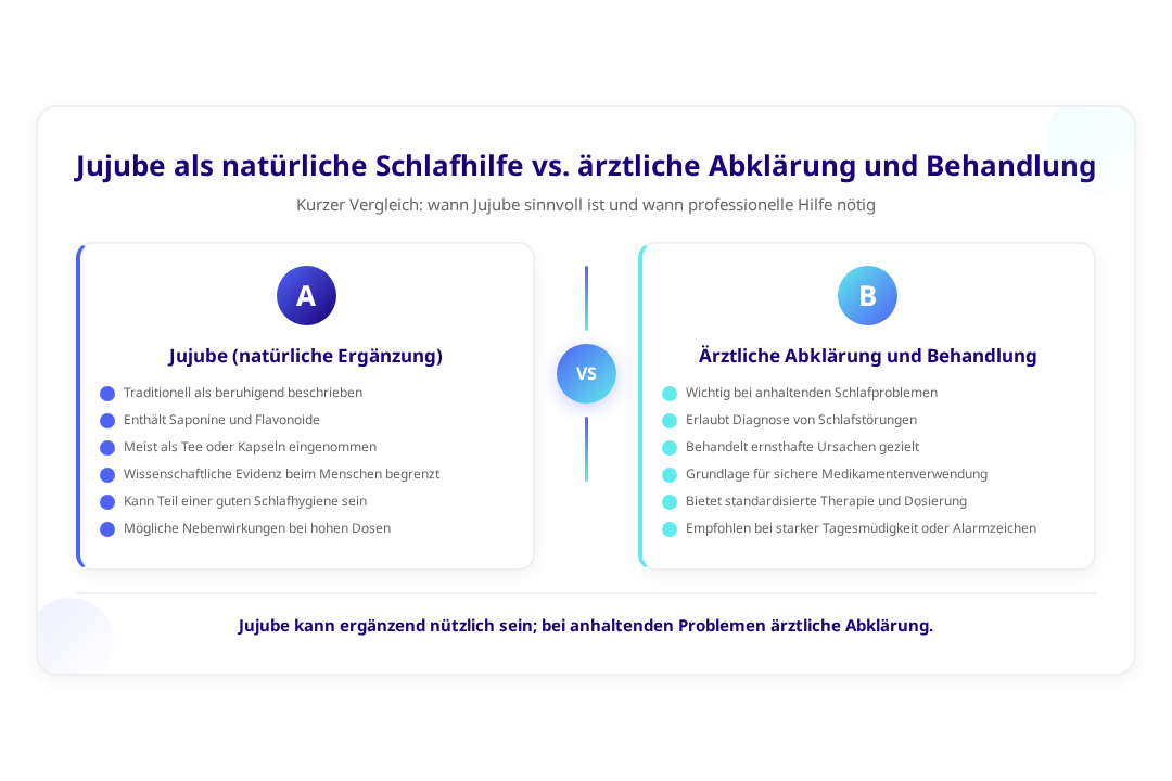 Während natürliche Hilfsmittel wie Jujube bei gelegentlichen Schlafproblemen hilfreich sein können, ersetzen sie nicht die medizinische Abklärung bei chronischen Schlafstörungen[5]. Anhaltende Schlafprobleme können verschiedene Ursachen haben, die eine gezielte Behandlung erfordern.