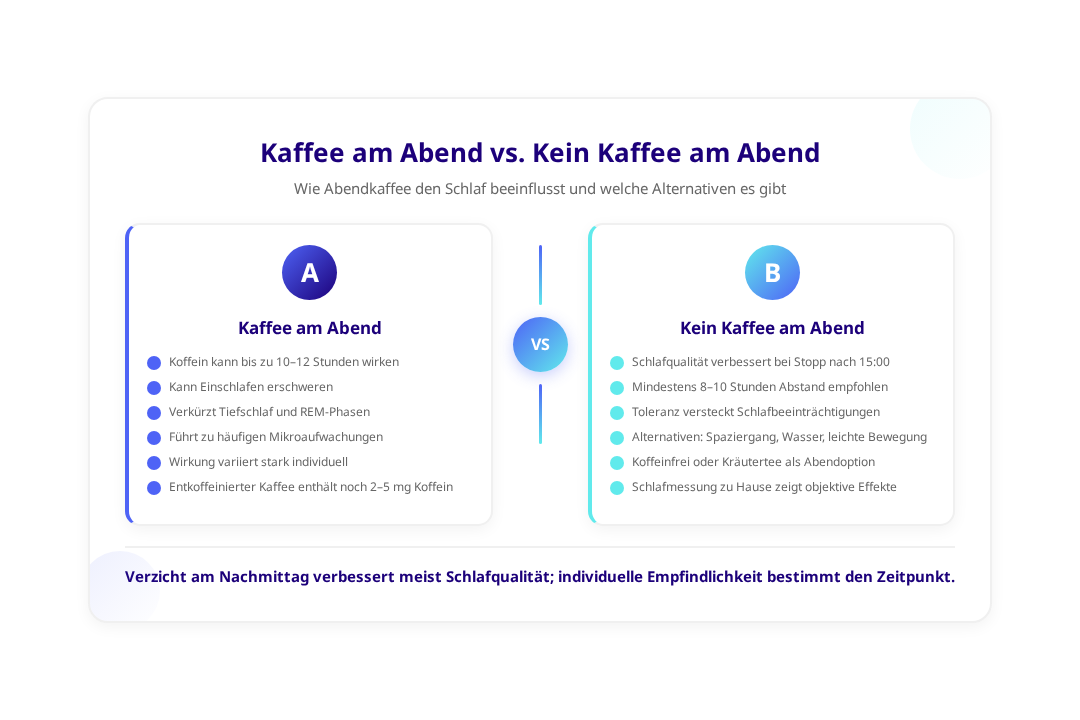 Die meisten Experten empfehlen, mindestens 6-8 Stunden vor dem Schlafengehen auf Koffein zu verzichten. Da Koffein jedoch bis zu 12 Stunden im Körper wirken kann, ist bei empfindlichen Personen ein Stopp bereits am frühen Nachmittag (14:00-15:00 Uhr) ratsam.