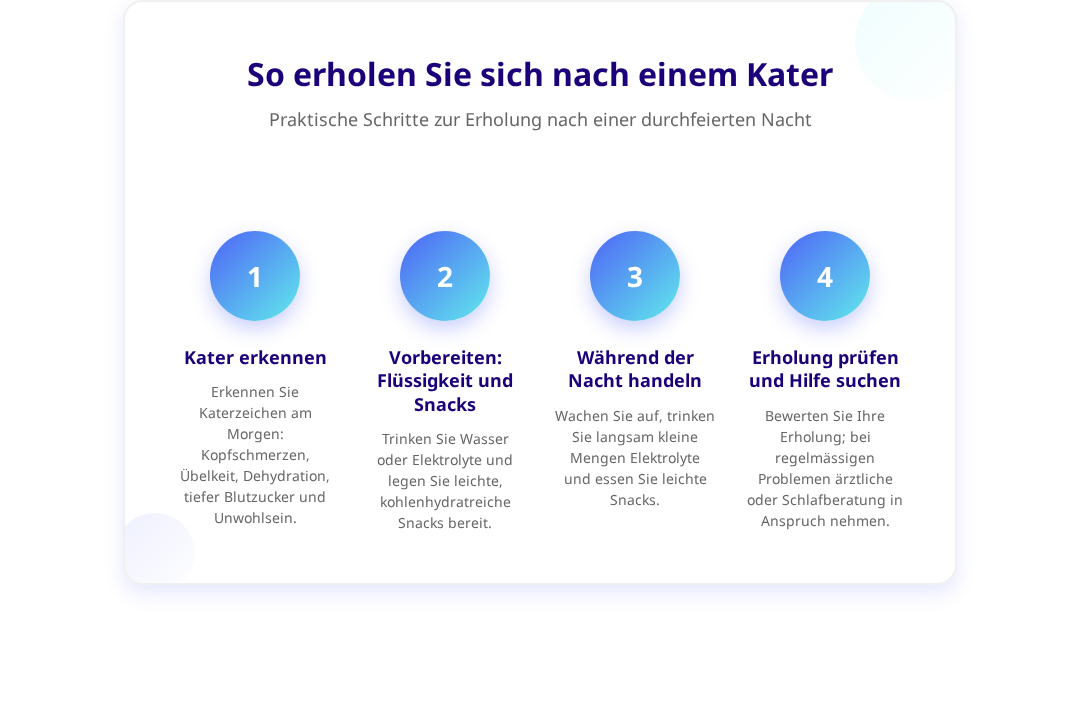 Obwohl man einen Kater nicht vollständig «ausschlafen» kann, gibt es durchaus wirksame Strategien, die die Erholung unterstützen. Wenn Sie während der Nacht oder früh am Morgen aufwachen, kann die richtige Herangehensweise den Unterschied machen zwischen weiterem Leiden und einer schrittweisen Besserung.