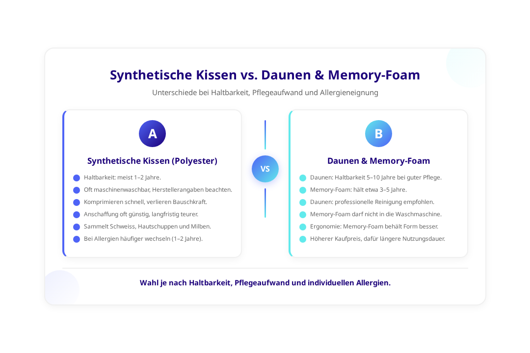 - Memory-Foam und hochwertige Daunenkissen halten oft länger als synthetische Materialien