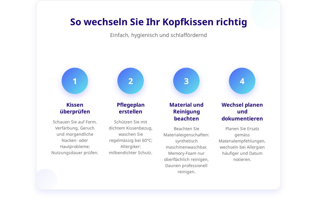 - Regelmässiger Kissenwechsel ist eine einfache, aber oft übersehene Massnahme der Schlafhygiene