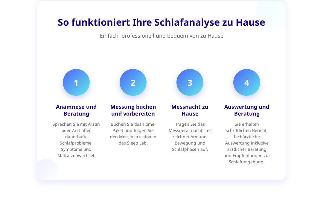 Starten Sie noch heute Ihre Schlafanalyse und lassen Sie uns gemeinsam an Ihrer Schlafgesundheit arbeiten. Mit unserem digitalen Schlaflabor bieten wir Ihnen eine bequeme und effektive Möglichkeit, Schlafprobleme von zu Hause aus zu diagnostizieren und zu behandeln. Zögern Sie nicht, den ersten Schritt zu einem erholsameren Schlaf zu machen.