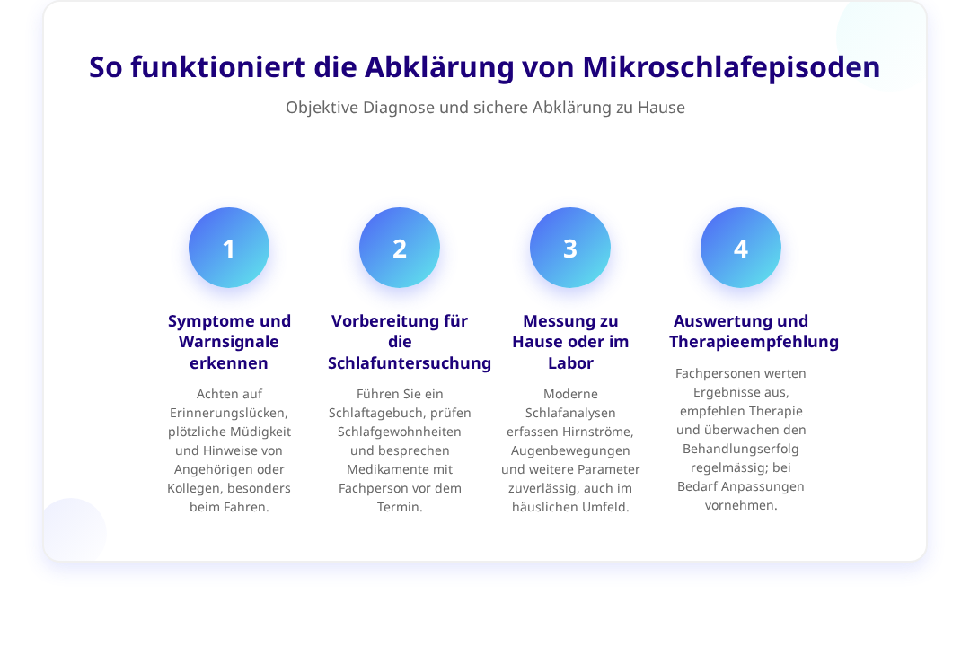 Die objektive Erfassung von Mikroschlafepisoden erfordert meist professionelle Messmethoden. Moderne Schlafanalysen können diese kurzen Schlafphasen durch Überwachung der Hirnströme, Augenbewegungen und anderer physiologischer Parameter zuverlässig dokumentieren, auch wenn sie von der betroffenen Person selbst nicht wahrgenommen werden.