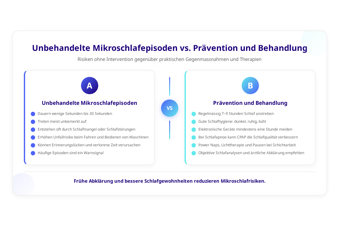 Langfristig ist es wichtig zu verstehen, dass Mikroschlafepisoden in den meisten Fällen behandelbar sind. Mit der richtigen Diagnose und Therapie können die meisten Menschen wieder ein normales, sicheres Leben führen. Spezialisierte Schlaftherapie kann dabei unterstützen, individuelle Lösungsansätze zu finden.