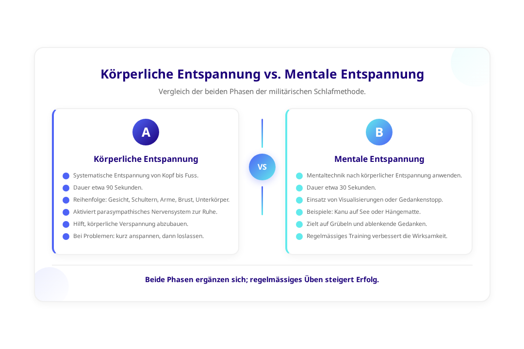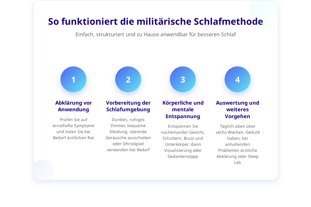 Die militärische Schlafmethode kombiniert bewährte Entspannungstechniken der Verhaltenstherapie. Progressive Muskelentspannung, eine Kernkomponente der Methode, ist wissenschaftlich gut untersucht und zeigt nachweisbare Effekte bei Schlafstörungen.[2]