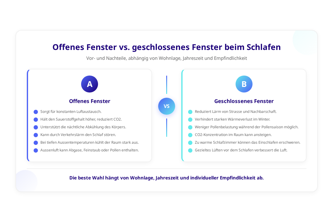 Beide Varianten haben Vor- und Nachteile. Ein geöffnetes Fenster sorgt für frische Luft und bessere Sauerstoffversorgung, kann aber durch Lärm, Kälte oder Allergene stören. Die gesündeste Lösung ist individuell und hängt von Ihrer Wohnsituation, der Jahreszeit und persönlichen Empfindlichkeiten ab.
