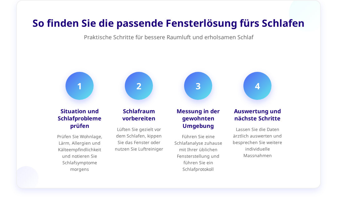 Führen Sie ein kurzes Schlaftagebuch, in dem Sie verschiedene Fensterstellungen und deren Auswirkungen auf Ihre Schlafqualität notieren. Achten Sie dabei nicht nur auf das subjektive Wohlbefinden am Morgen, sondern auch auf Faktoren wie Einschlafdauer, nächtliches Erwachen oder Müdigkeit am Tag.