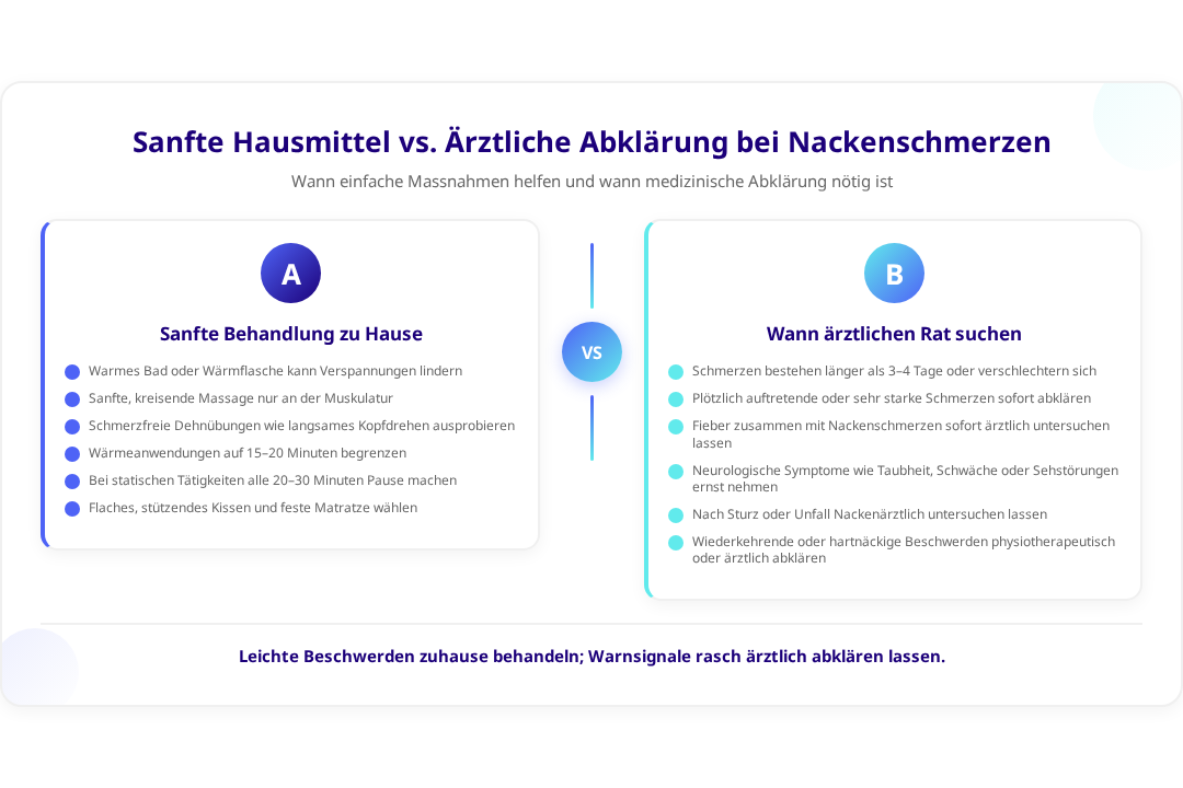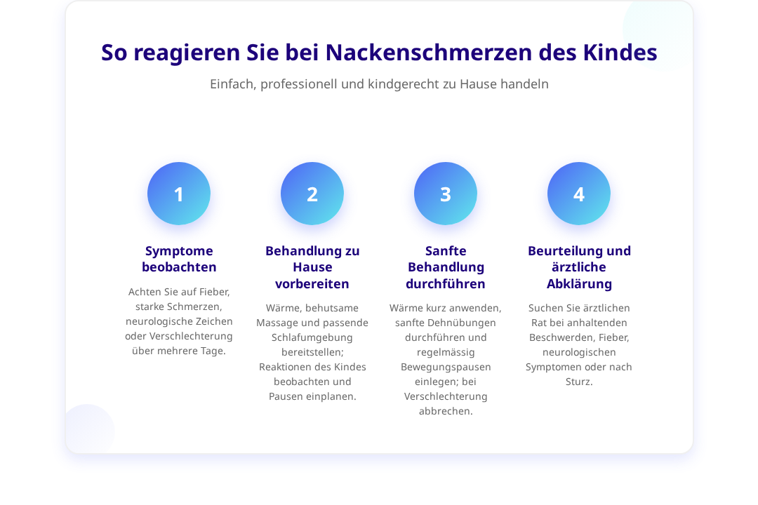 Während die meisten Nackenschmerzen bei Kindern harmlos sind, gibt es bestimmte Warnsignale, die eine ärztliche Abklärung erfordern.[3] Eltern sollten aufmerksam sein und bei entsprechenden Symptomen nicht zögern, medizinischen Rat zu suchen.