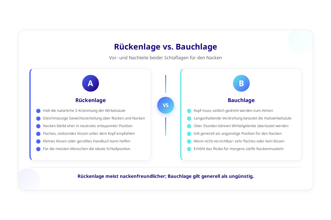 - Bauchschläfer: Sehr flaches oder kein Kissen, um Verdrehung zu minimieren