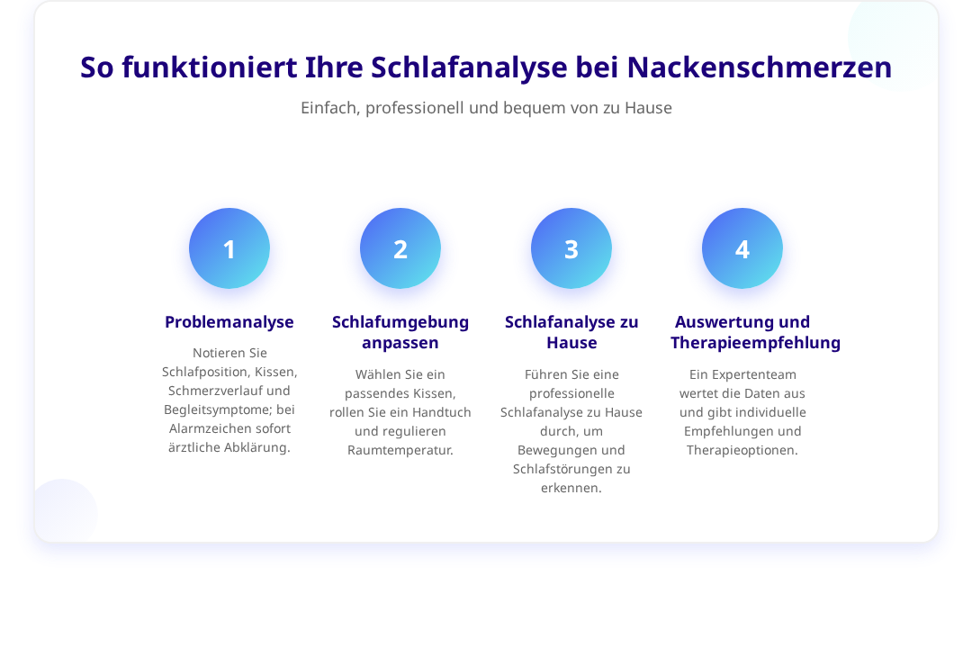 Eine umfassende Schlafanalyse kann aufdecken, ob zugrundeliegende Schlafstörungen die Nackenschmerzen verursachen oder verstärken.[4] Unentdeckte Probleme wie Schlafapnoe oder periodische Beinbewegungen können zu unruhigem Schlaf und häufigen Positionswechseln führen, die wiederum Nackenverspannungen fördern.