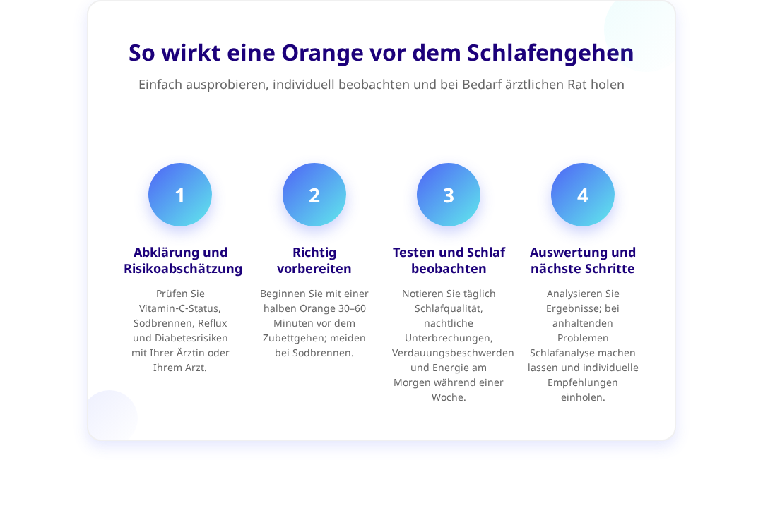 Beginnen Sie mit einer halben Orange und beobachten Sie Ihre Reaktion über eine Woche. Achten Sie dabei nicht nur auf die Schlafqualität, sondern auch auf eventuelle Verdauungsbeschwerden oder nächtliche Unterbrechungen.