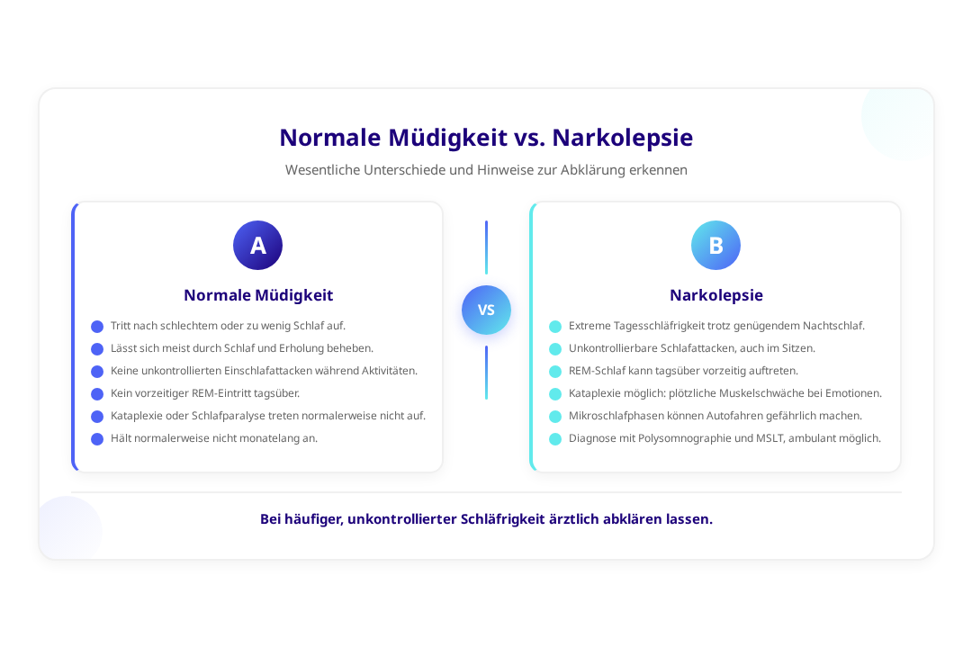 Normale Müdigkeit tritt nach schlechtem oder zu wenig Schlaf auf und lässt sich durch ausreichende Erholung beheben. Bei Narkolepsie hingegen besteht extreme Schläfrigkeit trotz genügend Nachtschlaf. Betroffene schlafen unkontrolliert in unpassenden Situationen ein, selbst während Aktivitäten oder Gesprächen.