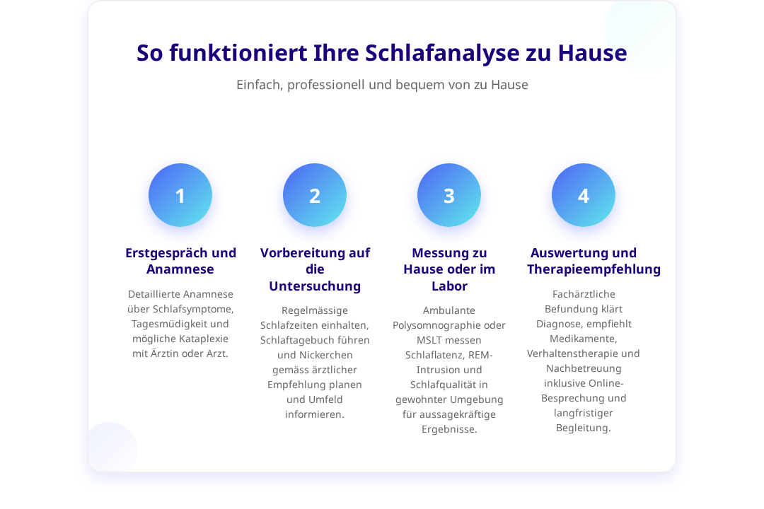 Die Diagnose erfolgt durch eine Kombination aus Anamnese, Schlaftagebuch und objektiven Schlaftests. Der Multiple Schlaflatenz-Test (MSLT) misst, wie schnell Sie tagsüber einschlafen und ob REM-Schlaf vorzeitig auftritt. Moderne ambulante Schlafuntersuchungen können bereits wichtige Hinweise liefern.