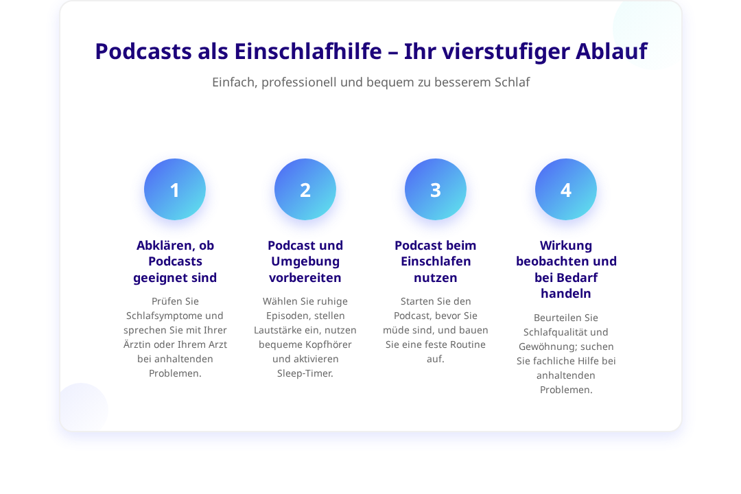 Podcasts sind eine wertvolle Ergänzung zur Schlafhygiene, aber sie behandeln nicht die zugrunde liegenden Ursachen von Schlafproblemen. Bei anhaltenden Einschlafproblemen oder anderen Schlafstörungen kann eine professionelle Abklärung notwendig sein.[5]