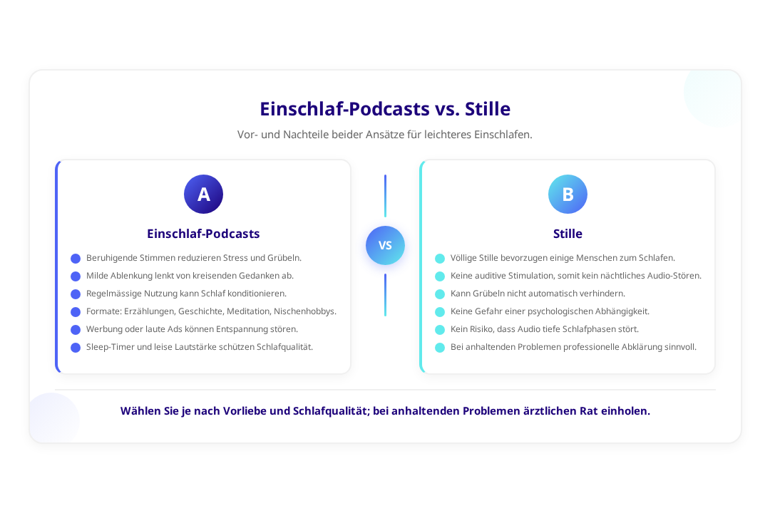 Nicht jeder Mensch reagiert gleich auf auditive Einschlafhilfen. Während viele Menschen von Podcasts profitieren, bevorzugen andere völlige Stille zum Schlafen. Probieren Sie verschiedene Ansätze aus, um herauszufinden, was für Sie am besten funktioniert.