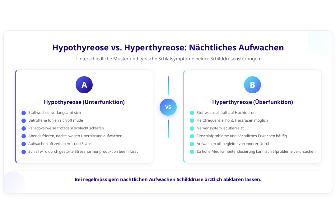 Bei einer Schilddrüsenüberfunktion (Hyperthyreose) läuft der Stoffwechsel hingegen auf Hochtouren. Der Körper produziert zu viel Energie, das Herz schlägt schneller, und das Nervensystem ist überreizt. Dies führt häufig zu Einschlafproblemen und nächtlichem Aufwachen mit Herzrasen oder einem Gefühl der inneren Unruhe.