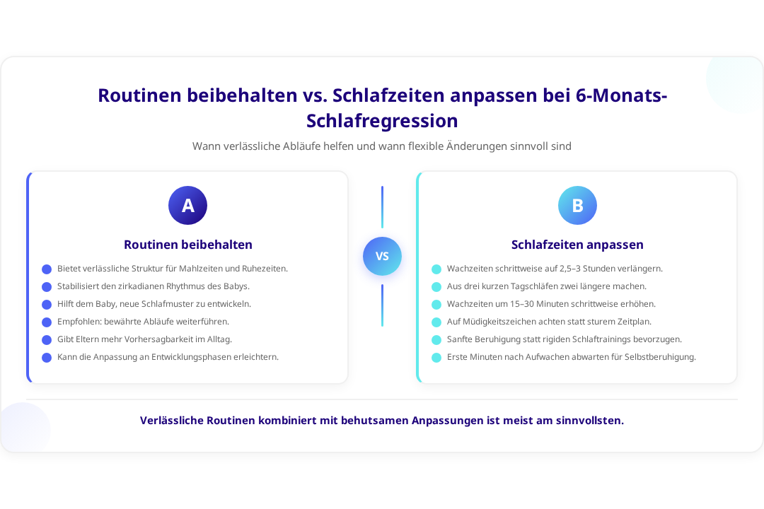 Viele Eltern fragen sich, ob sie ihre bisherigen Schlafgewohnheiten beibehalten oder ändern sollten. Grundsätzlich ist es sinnvoll, bewährte Routinen beizubehalten, aber flexibel auf die neuen Bedürfnisse einzugehen. Das kann bedeuten, dass Sie die Zeiten anpassen, aber die grundlegenden Abläufe beibehalten.