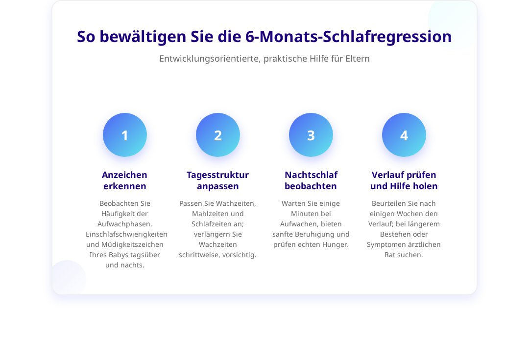 „Die 6-Monats-Schlafregression ist ein Zeichen gesunder Hirnentwicklung. Das Schlafmuster wird erwachsener, mit mehr Leichtschlafphasen, in denen Babys leichter aufwachen. Gleichzeitig verarbeitet das Gehirn intensive Lernprozesse.“