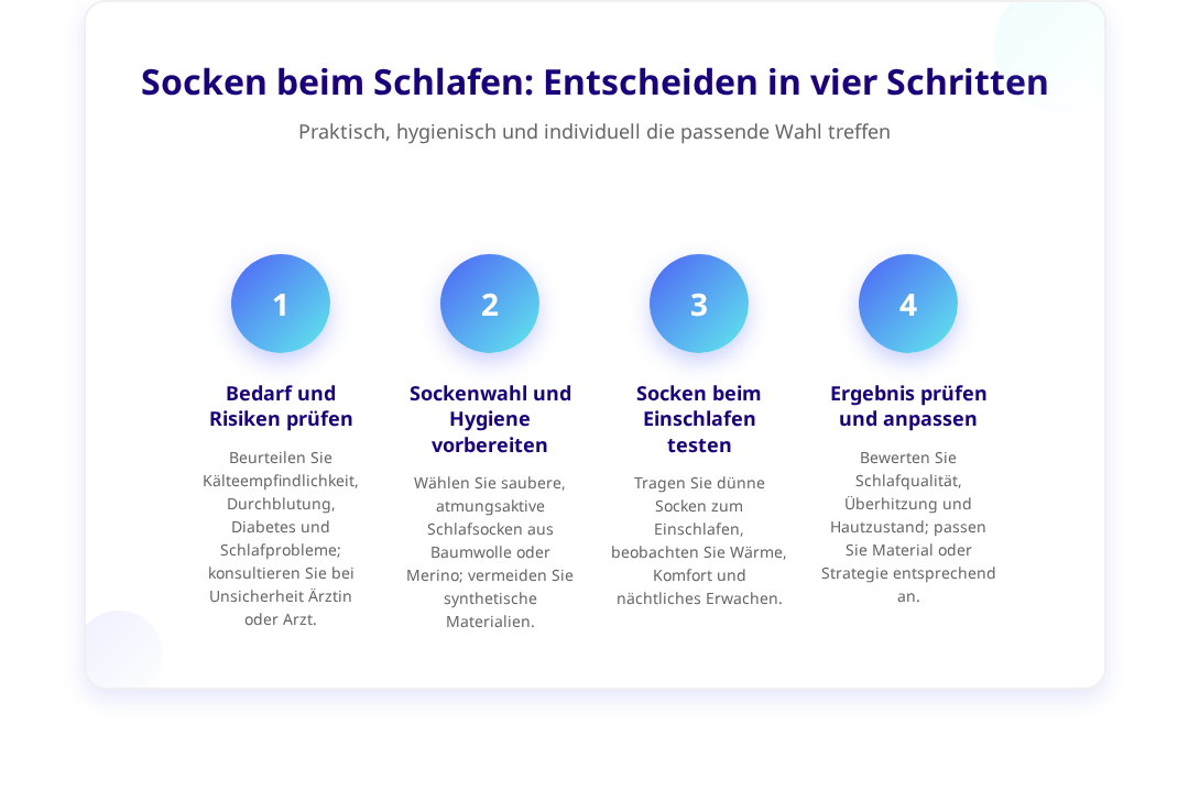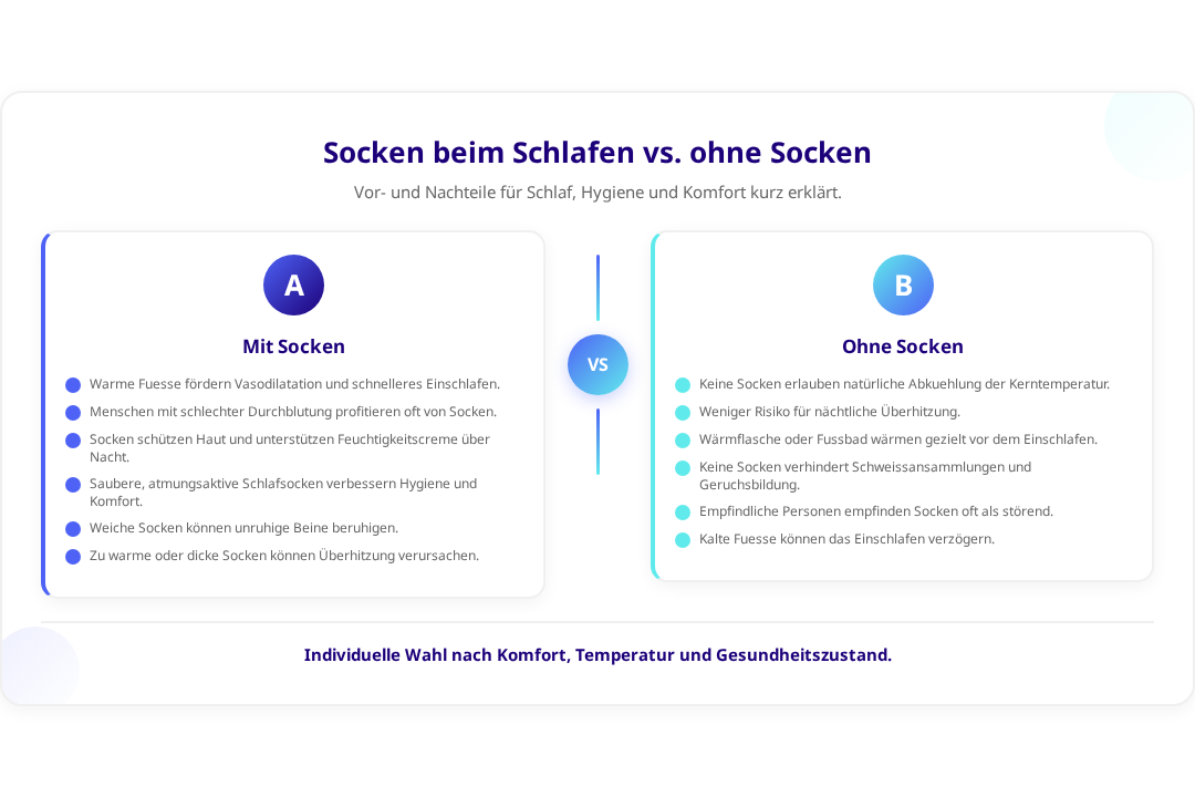 Die Entscheidung, ob man Socken beim Schlafen tragen soll, ist hochindividuell und hängt von verschiedenen Faktoren ab: der persönlichen Temperaturregulation, dem Gesundheitszustand, den Schlafgewohnheiten und der Wohnsituation.